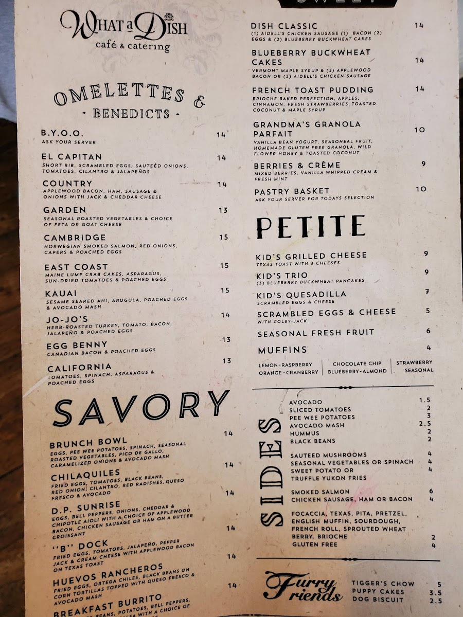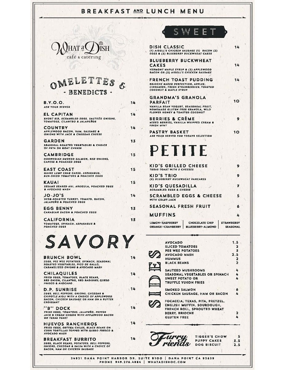eggs, yukon fries, black beans, potato, bell pepper, onion, cheddar cheese & salsa with a choice of bacon, ham or chicken sausage with secret sauce